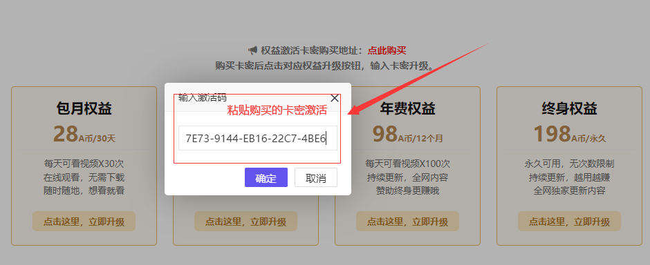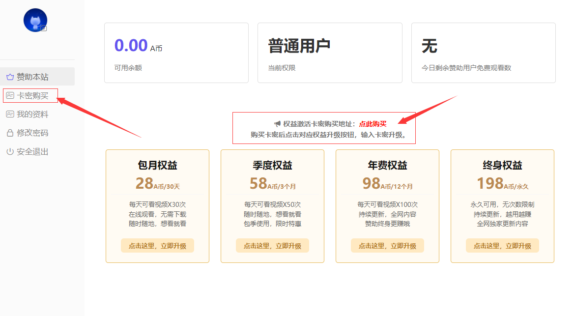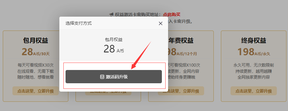 4.在用户中心选择卡密对应的权益升级按钮,激活权益。